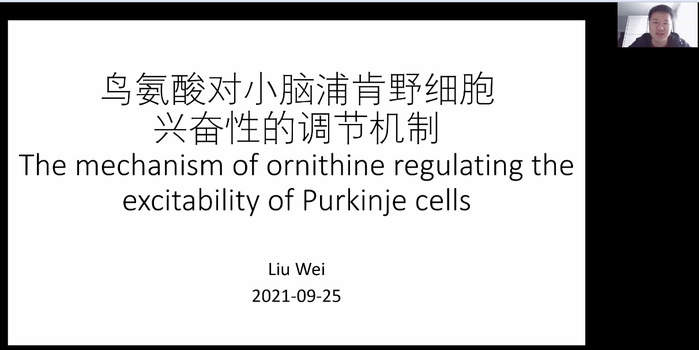 会议第四个议程,报告会特邀2010年“启明星”小组成员、北京大学刘伟博士作学术报告“鸟氨酸对小脑浦肯野细胞兴奋性的调节机制”,此报告是“启明星”小组成员的报告系列的首场报告,得到了大家热烈的欢迎,特别是在校“启明星”小组成员受益匪浅。