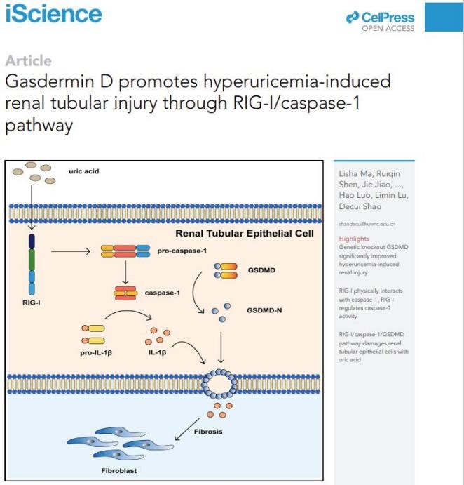 近期,bw西汉姆联生理学与神经生物学教研室邵德翠科研团队的研究成果《Gasdermin D promotes hyperuricemia-induced renal tubular injury through RIG-I/caspase-1 pathway》在SCI中科院二区杂志《iScience》(IF:5.8)在线发表,创意揭示高尿酸血症诱导肾小管损伤的新机制。