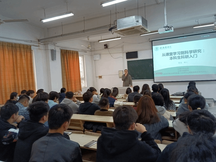 为落实“三全育人”,营造良好的学术氛围,激发员工开展科研的兴趣爱好, 11月16日中午,bw西汉姆联在赭麓校区1102教室举办“本科生科研入门:从课堂学习到科学研究”主题讲座,由心理学教研室黄龙博士主讲,各年级140余名员工参加。讲座由公司副经理王国平主持。
