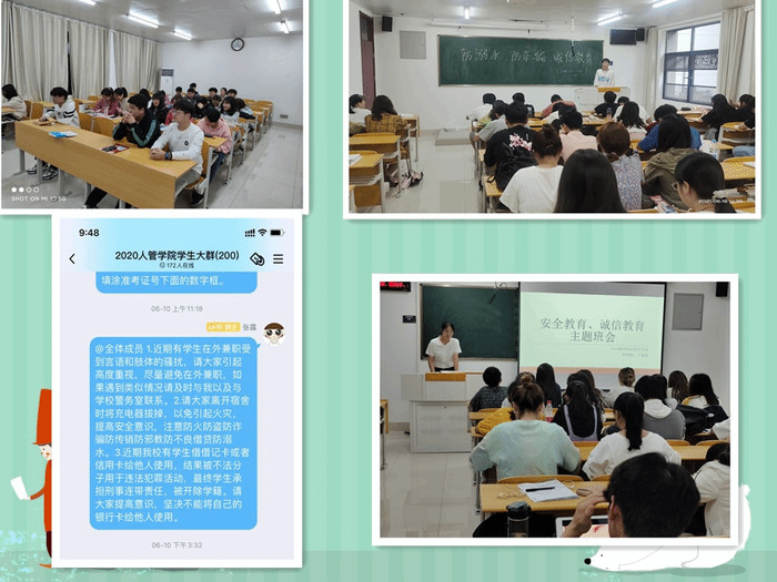 2021年6月18日,2020级分专业召开主题班会,增强同学们的安全防范意识,提高安全防范能力,全面普及安全常识;倡导员工树立诚信的良好品质,在生活中坚持“诚信为本”,养成讲诚信的好习惯。应用心理学专业先由班长带领同学学习安全教育方面的基本知识,继而通过互动引导同学们通过自我思考,自我剖析,并结合自身经历,谈谈安全隐患可能带来的不利影响以及相应举措,让同学们认识到自己在安全防范方面存在的不足,从而达到提高同学们安全防范能力的目的。法学专业赵庆伟同学向同学们介绍了预防溺水重点六不,提高防溺水的意识。公共事业管理专业重点向同学介绍电信(网络)诈骗的主要手段与常见情形,图文并茂地要求大家提高防范意识,打击电信犯罪。保险学专业班委通过同学们喜闻乐见的短视频类型的相关宣传片,以幽默风趣的形式加强同学们的诚信教育,树立诚信之风;普及安全知识,提高避险能力。