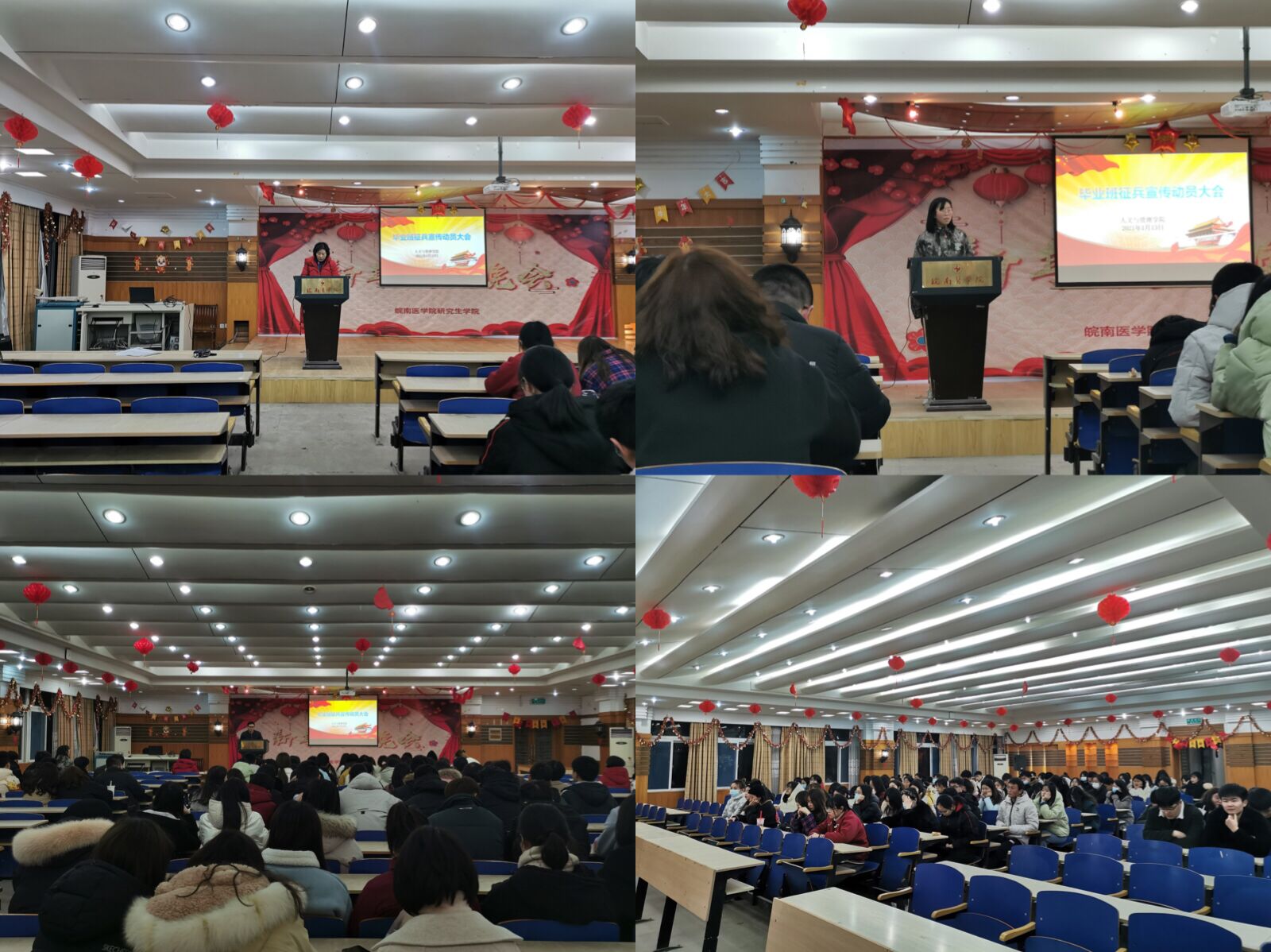 1月13日晚7点在赭麓校区报告厅举行2017级毕业生征兵宣传大会,人文与管理公司党委书记窦弘、2017级辅导员徐德磊及2017级在校毕业生参加,会议还特别邀请了退伍士兵2018级保险专业程心慈同学。窦弘在会上说到参军入伍就是热血青年锤炼品质,树立信仰,实现伟大抱负的有效途径,同时鼓励各位毕业生不负青春,筑梦军营,牢牢握住钢枪,为国为家挥洒青春的热血和力量;接着,退伍士兵程心慈同学从亲身的经历出发,讲述了自己的军旅生活和学习经历,分享了自参军以来的成长和收获,鼓励大家把个人理想筑梦军营,书写无悔的青春篇章。
