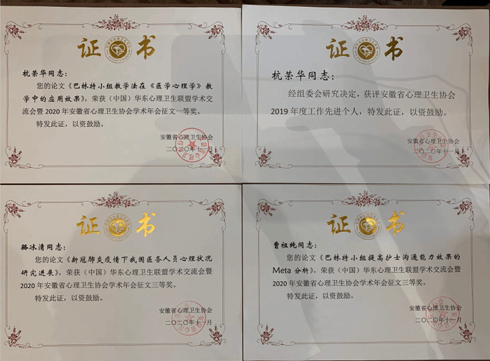 大会进行了年会学术论文的征集评选,公司杭荣华教授的论文《巴林特小组教学法在〈医学心理学〉教学中的应用研究》荣获一等奖,2018级应用心理学专业研究生曹祖纯的论文《巴林特小组提高护士沟通能力效果的Meta分析》和2020级应用心理学专业研究生骆冰清的论文《新冠肺炎疫情下我国医务人员心理状况研究进展》获三等奖。大会还对协会年度工作先进个人和先进集体进行了表彰,杭荣华教授获“安徽省心理卫生协会2019年度工作先进个人”称号。