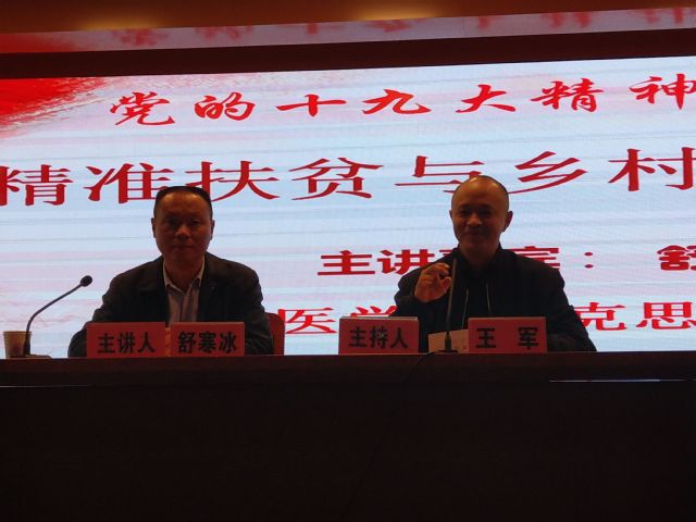 舒寒冰老师主要从习近平总书记在党的十九大上的发言与党的十九大精神的内涵、“要金山银山,更要绿水青山”与建设美丽乡村的战略等方面进行了详尽的阐述。报告紧扣“精准扶贫与乡村振兴战略”的同时,旁征博引,尽展文人风姿,将一幅“开轩面场圃,把酒话桑麻”的好景映入眼帘;黄土为墙石为路,山岚缭绕伴晨雾,舒老师话语中静谧安详的乡村寄托了他“无处安放的乡愁”, 使得在场师生共同在诗画中深刻领会党的十九大精神的意义所在。