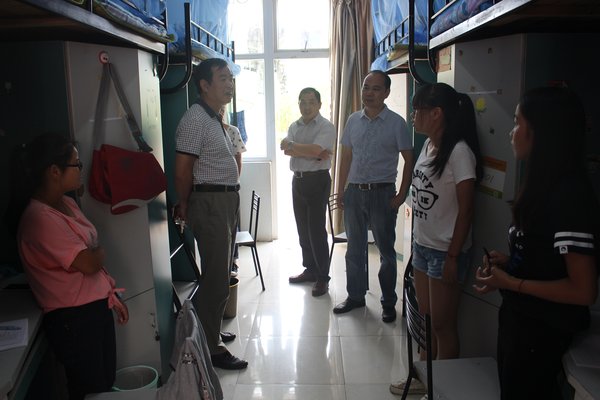 9月5日下午,人文与管理公司党总支书记王金权、经理胡鸿、副经理王国平、员工工作秘书和各专业辅导员一行深入员工宿舍看望2016级新生,与新生们进行交流,给他们送上关怀和问候。