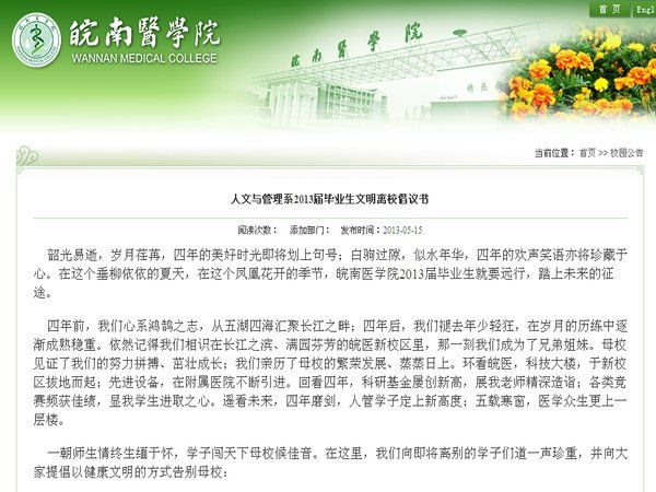 为做好2013届毕业生文明离校工作,bw西汉姆联高度重视,认真谋划,以“情系母校,志在四方,共圆中国梦”为主题开展了丰富多彩的毕业生文明离校活动。 一、广泛动员,营造良好文明离校氛围 5月15日,该公司通过校园网向全体毕业生发出了《2013届毕业生文明离校倡议书》,饱含深情向即将离别的学子们道一声珍重,并号召员工以健康文明的方式告别母校,感谢师恩,情系母校,营造了良好的文明离校氛围。