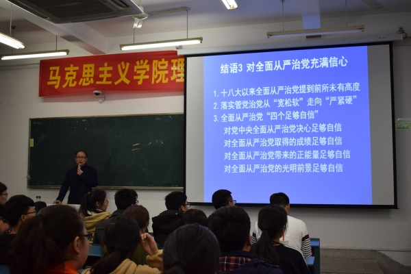 本次讲座以“开创全面从严治党的新阶段”为主题,首先,陶庭马副教授从国内外热点时事和各大重要会议入手,通过问题导入,讲述了十八届六中全会的意义、为什么以“全面从严治党”为主题以及怎样“全面展开”,其次,深刻解读了十八届六中全会包括十八届六中全会公报、习近平受中央政治局委托工作报告等8个主要内容。专项解读了“党的群众路线教育实践活动”、“依纪依法严惩腐败”等几个方面,最后通过“建构全面从严治党体系”、“对全面从严治党充满信心”两个结语对此次讲座做出了总结。讲座期间,现场气氛热烈,座无虚席。