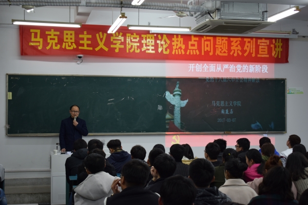 思想引领齐聚力,文化认同勇担当。为进一步树立和践行社会主义核心价值观,强化理想信念教育,2017年3月7日晚七点,bw西汉姆联在1102教室举办了十八届六中全会以来的理论热点问题宣讲。本次讲座诚邀到马克思主义公司副经理、陶庭马副教授主讲,bw西汉姆联入党积极分子和全体党员同学共计150余人聆听了讲座。