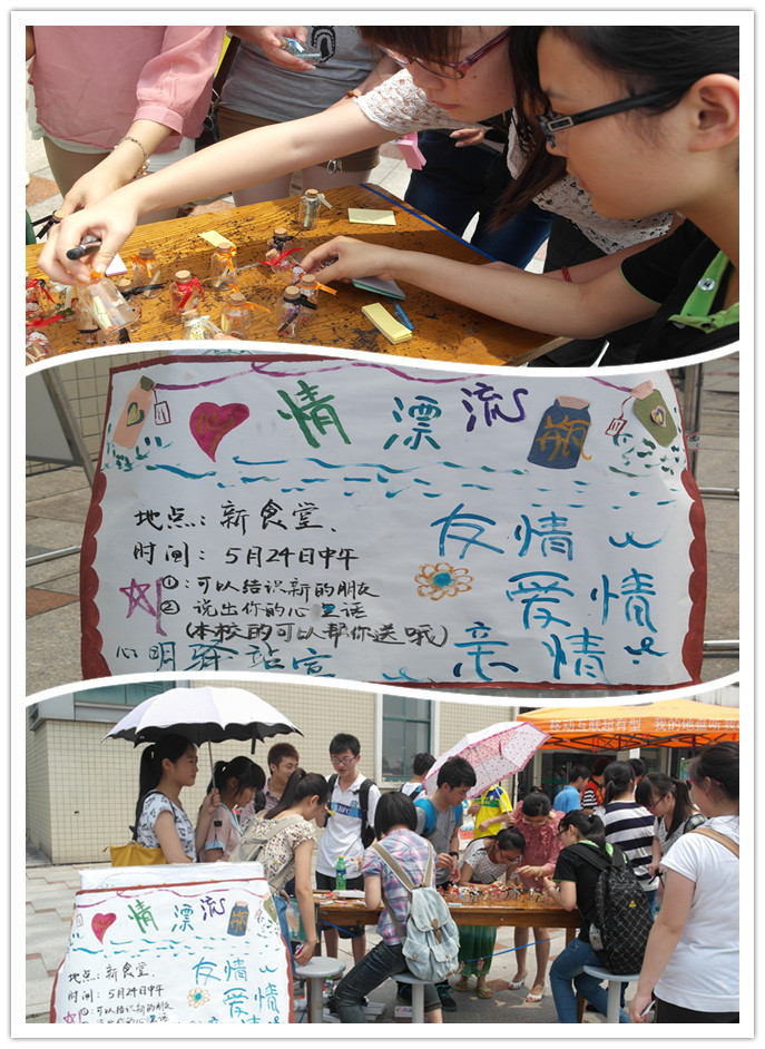 用青春拥抱时代,在五月心理健康月中,人文与管理系“心明驿站”在心理教研室刘新民教授、何苗苗和范佳丽老师的指导下,开展了以“中国梦・你我心・皖医情”为主题的积极心理健康普及活动。 心情漂流瓶,传递积极心理正能量。5月24日午时,人文与管理系“心明驿站”在新食堂开展了“积极心理正能量,心情漂流瓶”活动。活动中,同学们热情参与,纷纷以书面的形式表达了自己的心情、思想以及积极的生活态度,展示了当代老员工对自由、希望和友谊的感知能力,面对挫折不屈不饶的战斗力。每一个漂流瓶都向我们传递着心理正能量,鼓舞着我们乐观向上,积极进取。