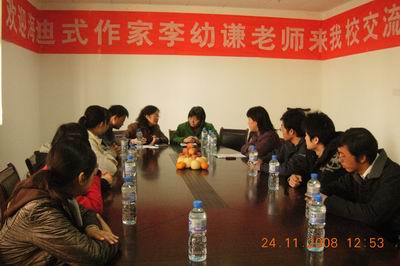 人文与管理系刘华副主任,员工秘书蒋群老师,06、07级心理专业辅导员王远芳老师参加了交流会。首先,刘华副主任向李幼谦老师介绍了我们系爱心助残的基本情况,并对李老师的到来表示欢迎。助残服务队的员工代表向李老师介绍了助残服务队的成立情况和一直以来开展的活动。在同学们的介绍后,李老师深深为爱心志愿者的服务而感动并也对志愿者服务提出了希望与要求,她表示要用自己的文字来表达对这群志愿者的感谢。会议最后,李老师还送给我们志愿者一本她最近新出版的书《独步天下》,并对人文与管理系的爱心助残活动给予了很高的评价。