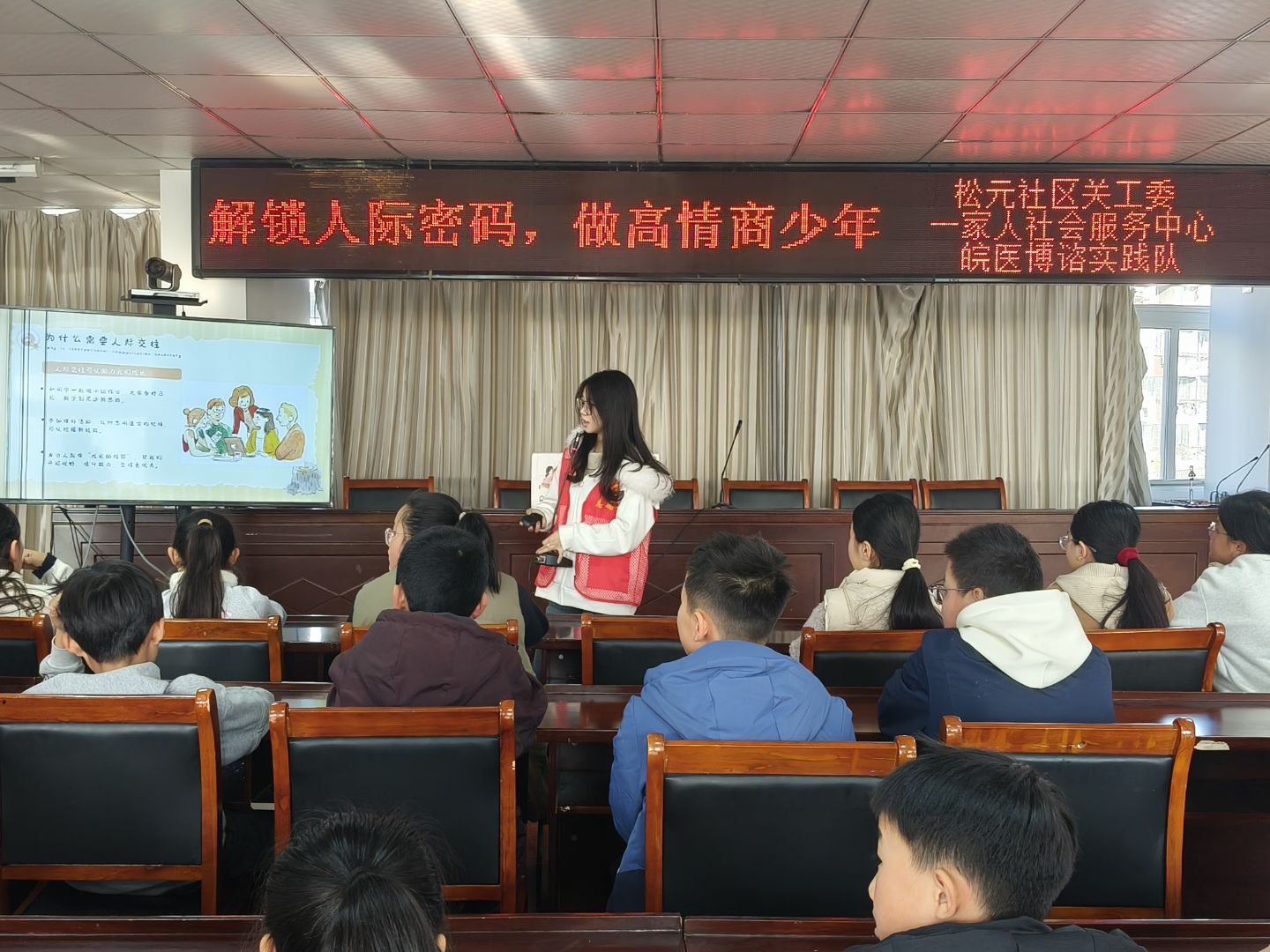 活动旨在为儿童构建健康的人际交往认知体系,借助“你比我猜”互动游戏进行破冰,通过“你比我猜”这一过程使儿童在欢笑中直观认识到清晰、准确表达的重要性,为后续的知识讲解做好铺垫。宣讲环节,志愿者们结合儿童的认知特点,通过动画案例等方式展开核心内容讲解,从“什么是人际交往”“为什么需要人际交往”“人际交往的原则有哪些”和“遇到冲突怎么办”四个方面讲解人际交往的意义,引导儿童理性思考解决问题,避免采用哭闹或争吵的方式处理问题。宣讲最后的“小手掌寄语”环节,进一步深化了儿童对宣讲内容的理解与记忆。
