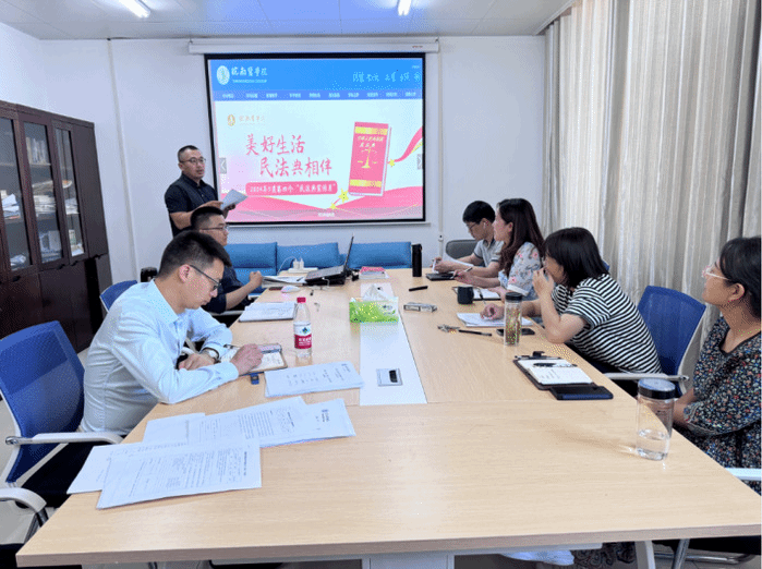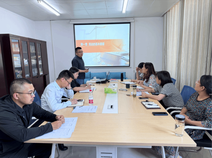 三、进一步推进民法典进课堂,充分发挥课堂主渠道作用,切实提升宣传教育的针对性和实效性。法学教研室深入开展民法典学课程集体备课活动,共同探讨、提升教学科研水平,进一步把民法典基本精神融入高校课程。主讲教师王武祥先从宏观方面对民法典的体例结构、习近平法治思想、价值精神进行介绍,再以“什么是民法”为切入点,围绕民法的基本原理,对概念、调整对象、基本原则、民事法律关系、民法的渊源、民法的适用等教学内容进行了深入阐述。与会教师分别提出意见与建议,进一步完善了民法学课程的教学设计,确保在专业课教学中有机融入民法典基本精神,进而探索教、学、研一体化的新型教学模式。