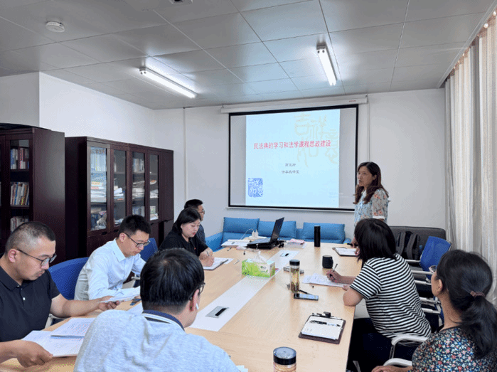 二、开展民法典主题教育研讨,积极探索民法典基本精神与法学专业课程思政建设的融入路径。法学教研室主任高玉玲教授以“民法典的学习和法学课程思政建设”为主题,紧扣主旨精神、法治价值,探索在法学类课程中如何推进课程思政建设。与会教师围绕研讨主题,结合自身负责课程的特点,提出了民法典学习与各自开展课程思政的结合点:例如如何将“人民至上”“生命至上”等立法理念融入到各门课的课程思政教学中。